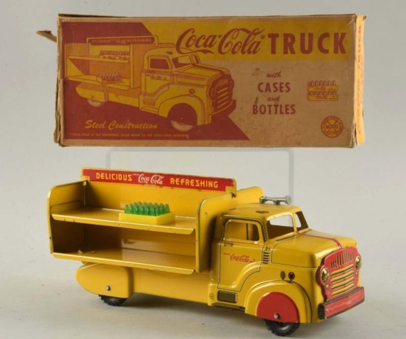 Includes original box with nice color graphics and nice depiction of truck. Marked "Steel Construction" and "Trademark of the Coca-Cola Company". Box is complete and looks like it has original cardboard insert. There is slight tearing to one end flap,…