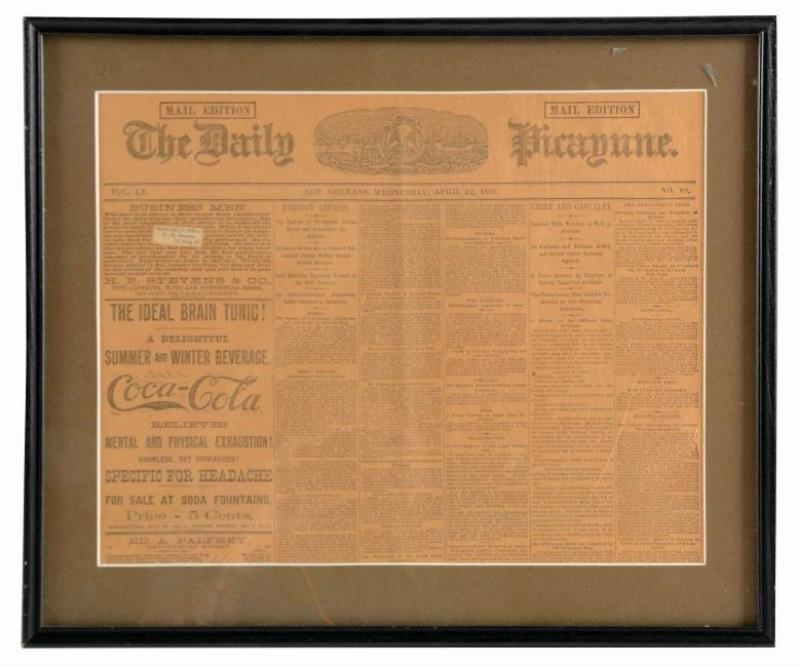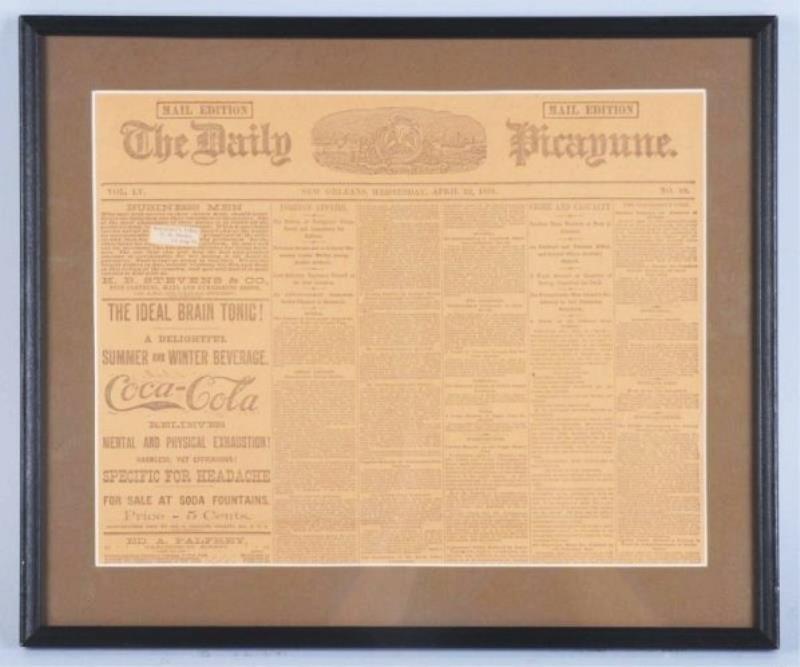 Framed and matted under glass is a large portion of the Daily Picayune from New Orleans. Shown at left is an oversized ad for Coca-Cola with health claims mentioned and Asa Candler’s name at bottom. Age toning with no wear!…
