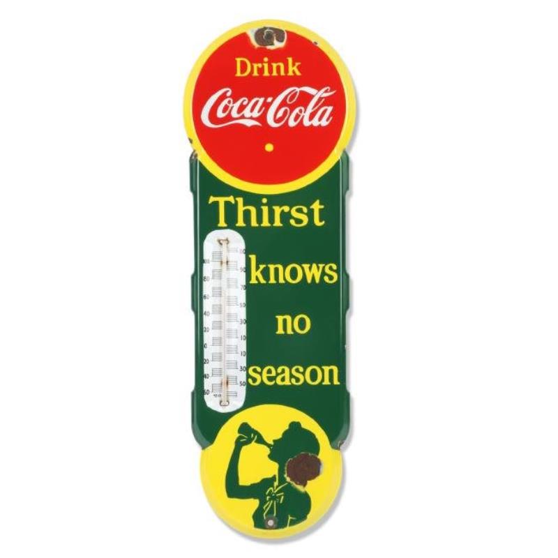 COCA-COLA PORCELAIN THIRST KNOWS NO SEASON THERMOMETER.