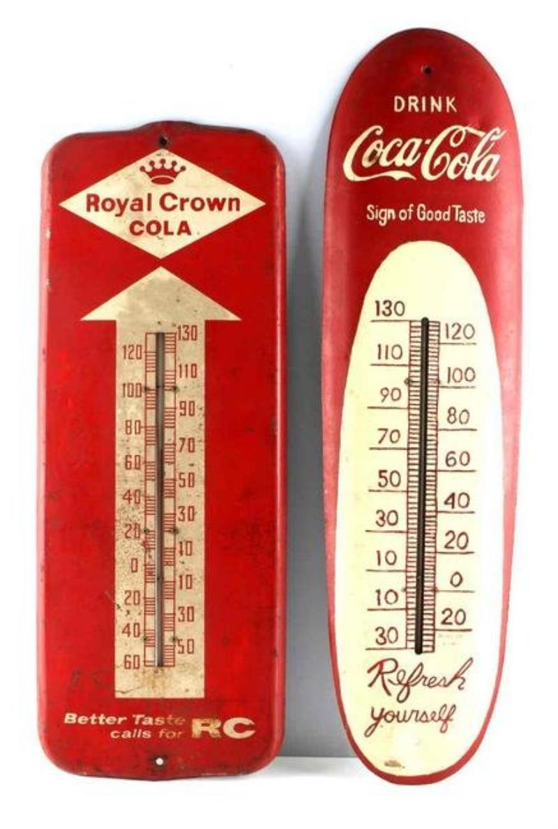 Vintage RC Cola advertising thermometer sign, 25X10 inches. Vintage 1940-1950's Cola Cola thermometer sign, 30x8 inches. Both in overall good condition with surface weathering to finish and metal.
