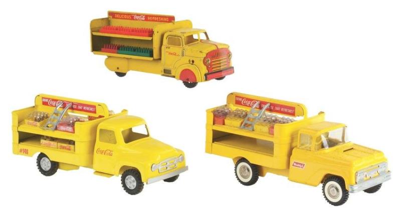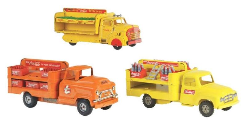 Two are Buddy L: one is an orange color, with GMC front, nice "DRINK COCA-COLA" decals, the second one is a Buddy L in yellow. The third is a Marx Coca-Cola tin-litho truck. All have some replacement Coca-Cola cases and…