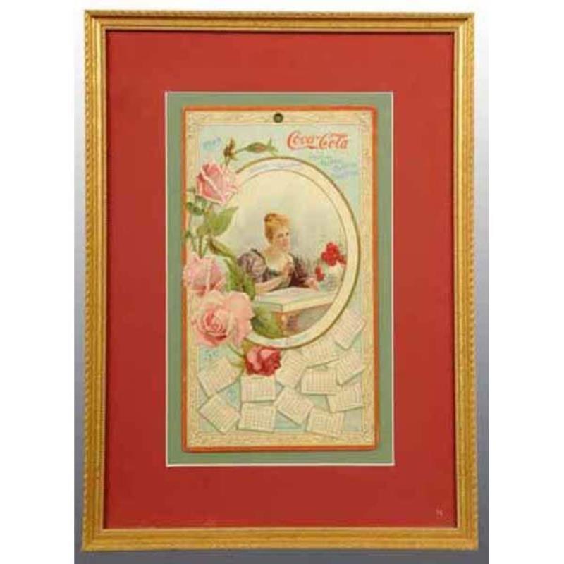 Coca-Cola Calendar, c.1899, Coca-Cola Relieves Mental and Physical Exhaustion-Cures Headache, beautiful lady at writing desk, embossed w/roses & months of the year, stamped "Published by Wolf & Co. Phila.", prof framed , image in Exc cond, very minor inpainted surface…
