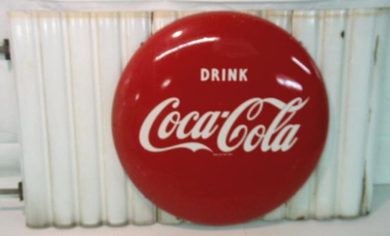 Coca Cola Porcelain Sign. 24" Porcelain Button. On 24" x 40" tin backing and support bars. Condition: Very Good. NOTE! Please read the following before bidding. IMPORTANT INFO ABOUT THIS AUCTION This item is in an "eBay Live Auction." This…