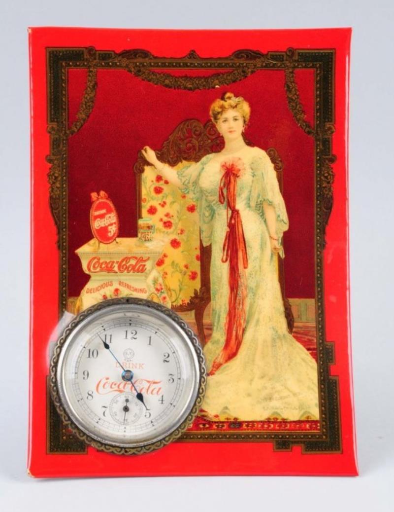 This is from the Mitchell collection and dates to 1905-1910. These small clocks were given to better soda fountain operators. Although the face is now darkened and faded to the point to where the Coca-Cola logo is nearly impossible to…