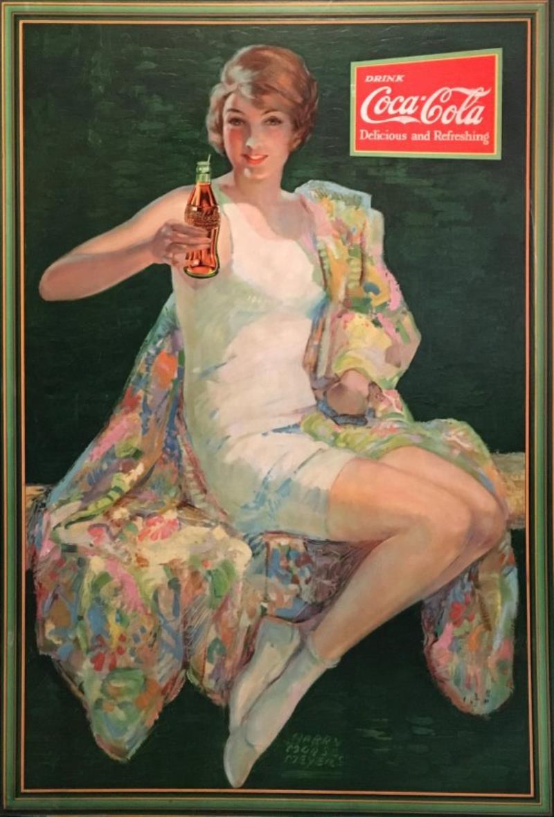 32" x 21 1/2" framed under glass; small nail, tear and punch top center; significant fading on red Coke logo primarily; fading is not readily apparent in other areas as good color remains; artwork is signed Harry Morse Meyers; corner…