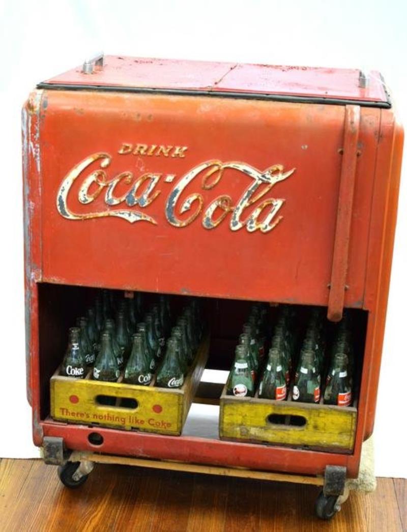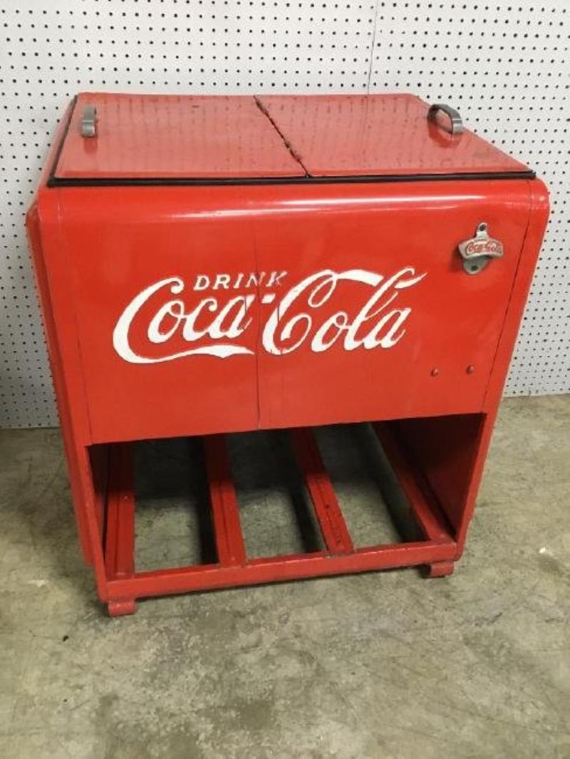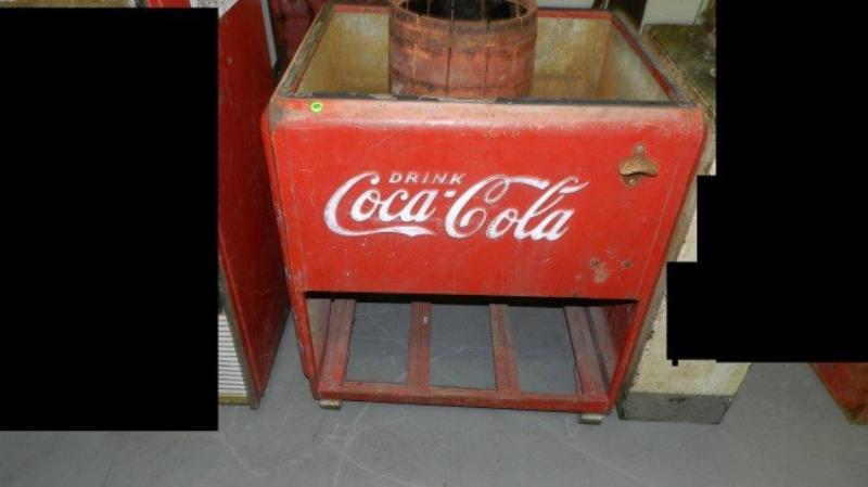 Chest has bottom storage cases.Garage find In has found condition. Cover and cap holder repainted. Does have some wear, fading and scratches. Embossed Coca-Cola under cover. 35 inches tall x32 inches wide x 25 inches deep. Chest being sold with…
