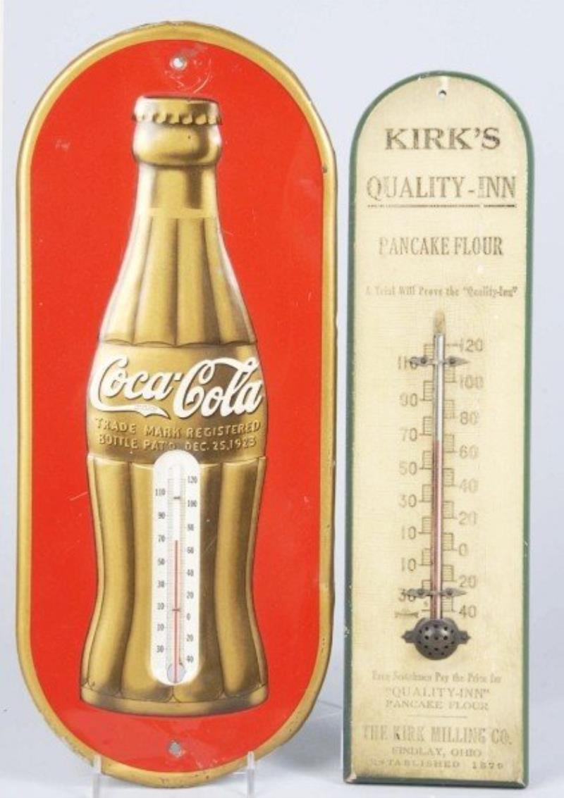 Includes 1920s Kirk's Flour wooden thermometer, 1930s Coca-Cola gold bottle thermometer, and 1930s to 1940s tin Ramon's Pills thermometer. General overall wear, marks, scratches, small dents, and nicks. Size: Largest: 21" T.