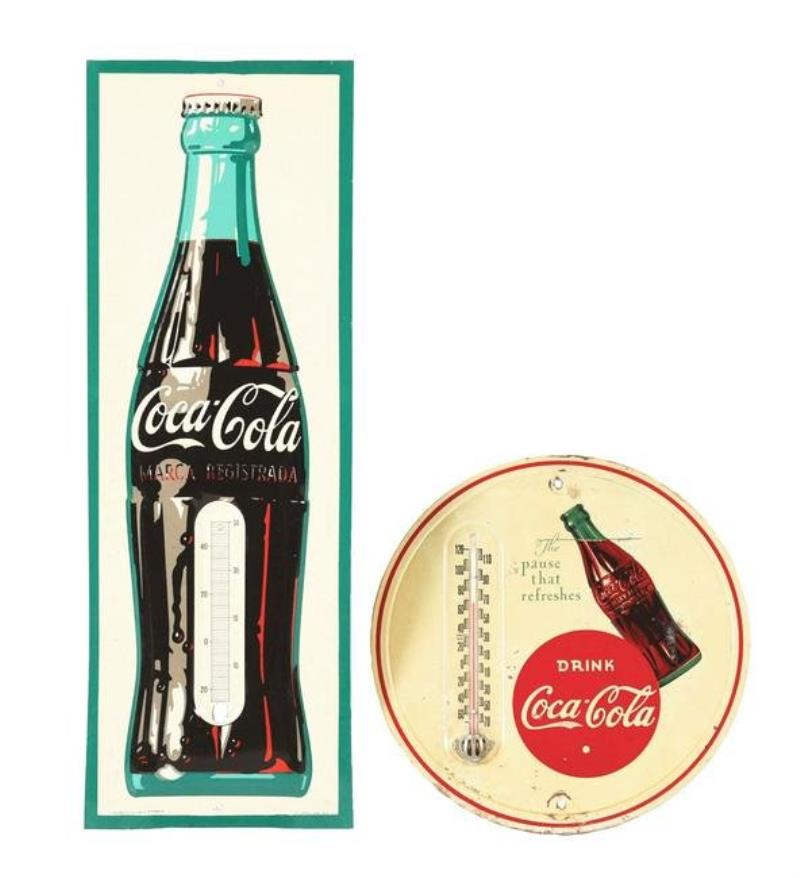 Coca-Cola Thermometers (2), embossed tin & celluloid,