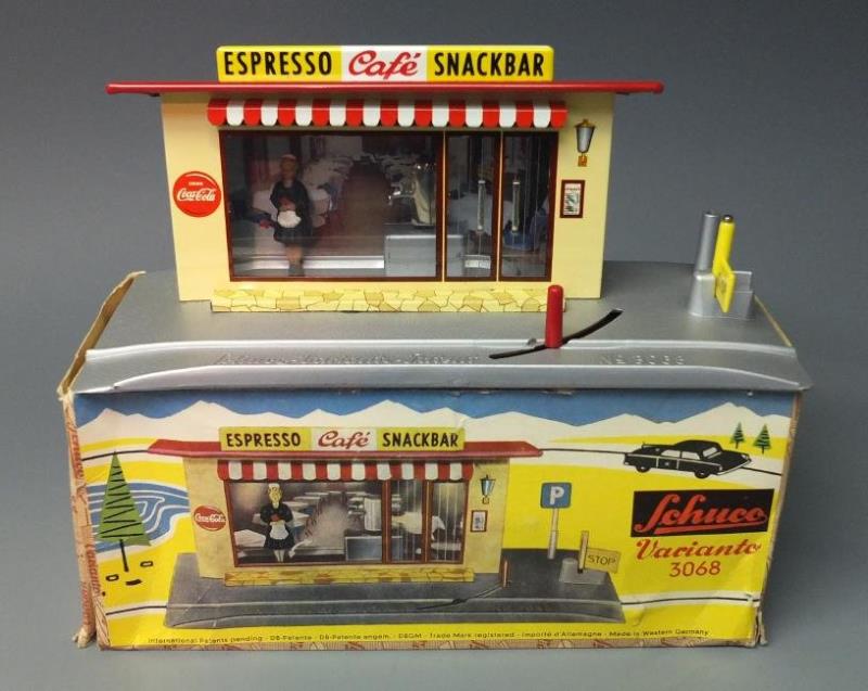 Made in Western Germany by Schuco. 1950's scarce & hard to find tin 3068 Expresso Cafe? Coca Cola Snack Bar & box. 8" long.