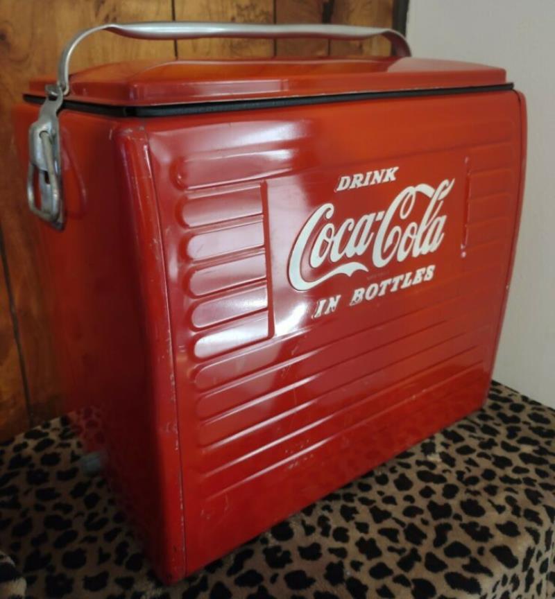 Acton Coca-Cola Picnic Ice Cooler. Made by Action Mfg in Arkansas City, Kansas during the 1950s, this heavy steel picnic cooler was designed to hold 24 Coca-Cola bottles. The outside in painted lettering, says "Drink Coca-Cola in Bottles (trademark)".