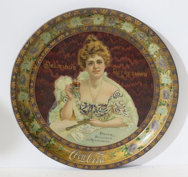 A beautiful 1903 Coca Cola tin tray, 9 11/16" diameter. "Delicious Refreshing", "Drink/ Delicious/ And Refreshing" "Chas. W. Shonk Co. Litho Chicago". Some crackling to finish, a few tiny white spots. Miss Hilda Clark. - Dimensions: 9.75" dia