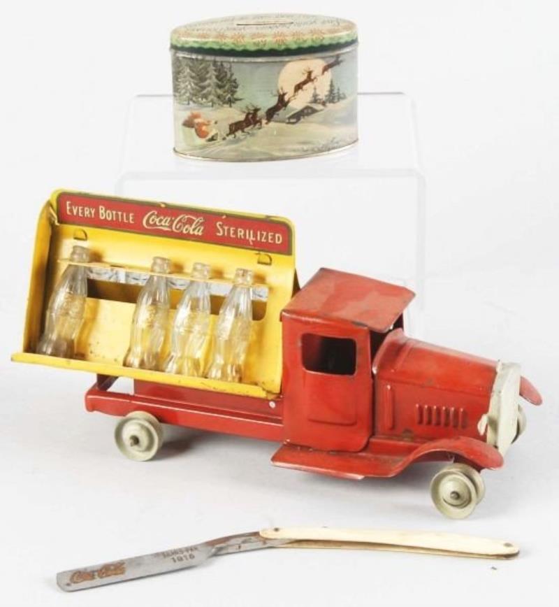 Lot includes a tin Coca-Cola truck (missing one bottle and tires), a Coca-Cola straight razor marked "Trans-Pan 1915", and a tin Santa Claus bank.Condition (Excellent). Size Largest: 10 - 1/2" L.