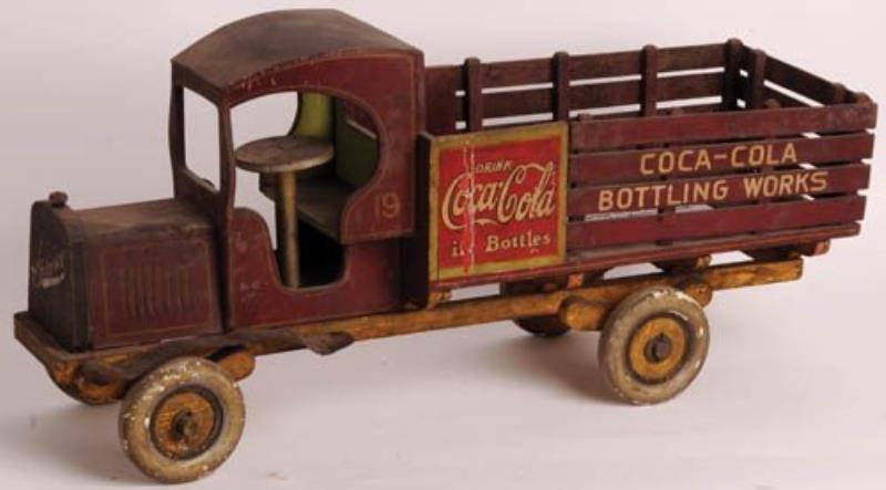Wood and tin 30" long flatbed Toy Truck Coca-Cola Bottling Works on both sides. Beautiful logo. Back gate flips down, has "1529 Bank St." painted on gate metal railing. Tin cab and wheels have a great deal of rust . The original red paint is good on cab, wear on side signs. This Toy Truck is from the early years of The Louisville Bottling Company, and belonged to Martin Schmidt. Purchased locally, the Truck was sent to the advertising department and adorned with Coca-Cola signage. The Truck has been part of the museum and the Schmidt family for all these years.