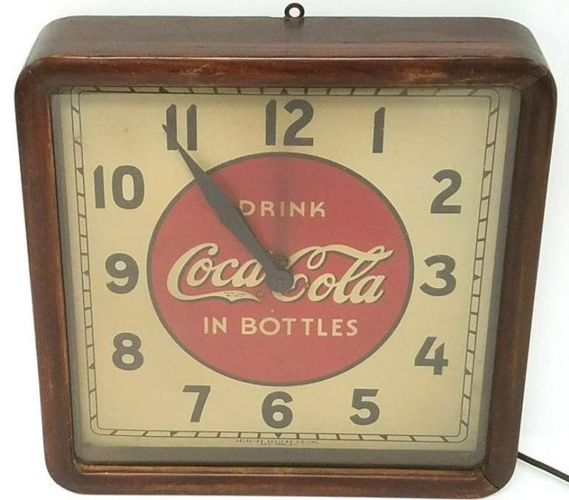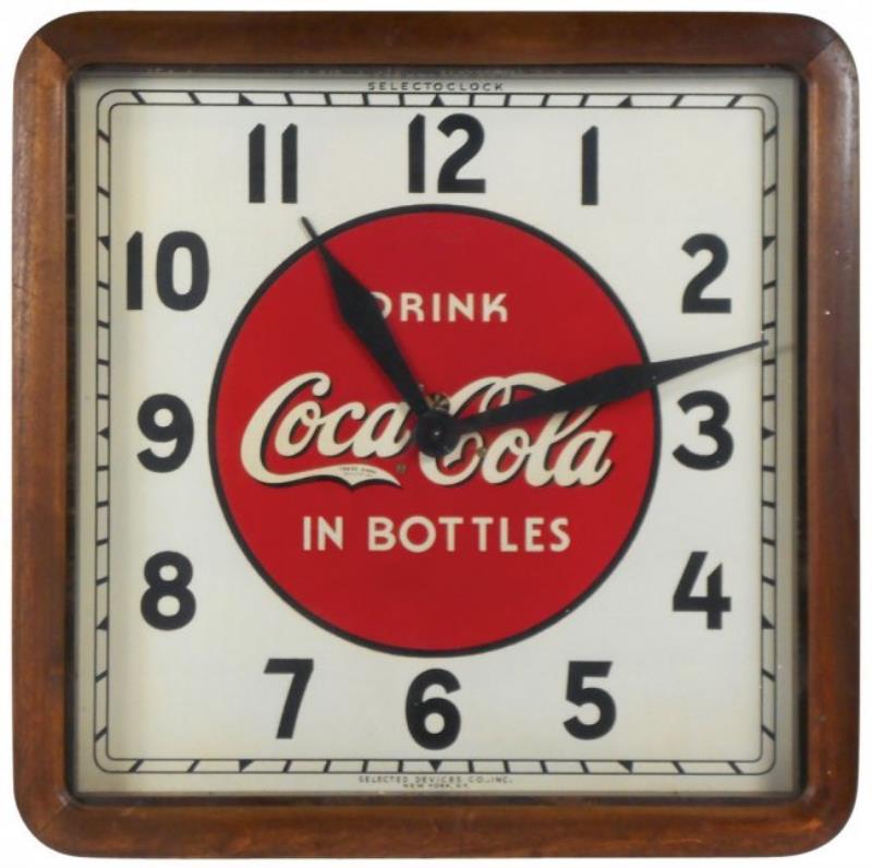 Coca-Cola clock, metal w/wood frame, c.1940's, Selected Devices Selecto Clock, Exc wkg cond w/minor wear, 16"Sq.